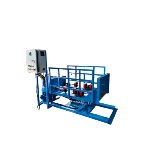 Load the drum upright with a drum truck or below-hook hoist onto the low platform.
